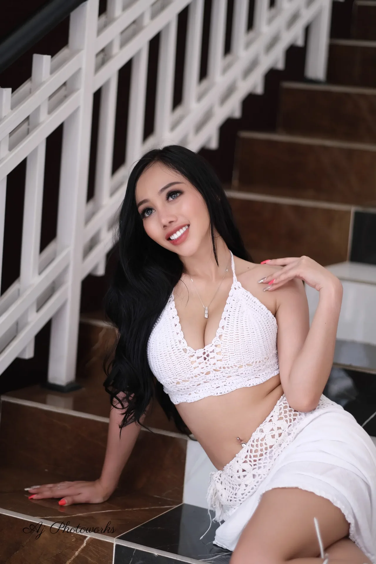 A woman in a white lace bikini poses gracefully on a marble staircase.